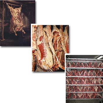 Dry aged beef was the early days norm. Beef carcasses were allowed to hang in a locker for a few weeks after slaughter to become more tender and flavourful. During dry-aging, moisture evaporates from the muscle creating a mature beef flavour. The meat's natural enzymes break down the fibrous, connective tissue in the muscle thereby tenderizing it.